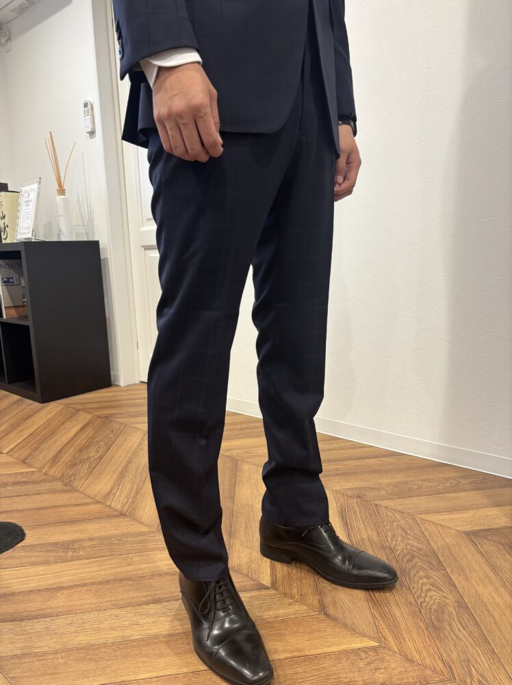 高身長の方は、足の長さを活かして「ハーフクッション(靴の甲にわずかに触れる程度)」で仕上げるのが最もスマート。短すぎると幼く見え、長すぎるとだらしない印象になりますが、オーダースーツならその「絶妙なポイント」を確実に捉えることができます。